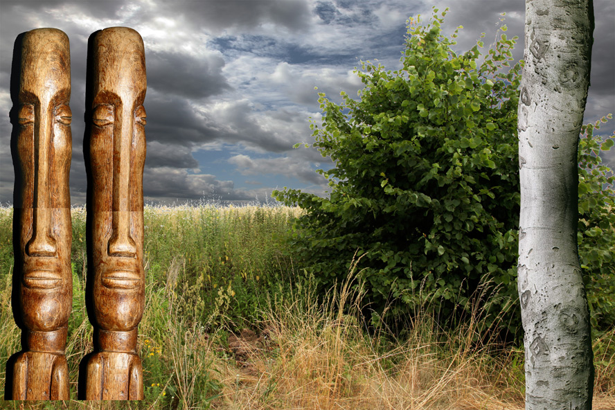 # ... zwei Figuren (Skulpturen), ein Baumstamm. Eigentlich ist es nur ein einziges geschnitztes Portrait, das hier fotografisch verdoppelt gezeigt wird - und dazu rechts, koennte man die Herkunft bestimmen. Die Initialen ELK auf der Rückseite weisen es als eine Arbeit Ernst Ludwig Kirchners aus, der sich in auch in Anlehnung an afrikanische Kunst begab. - Aber wichtiger weist die Collage auf eine, im Kunsthandel verbreitete, Verunsicherung hin: auf die Diskussion um Original und/oder Faelschung. Auch in dieser Zusammenstellung (zu einem Triptychon), ist der Betrachter auf eine eigenstaendige Anordnung und Interpretation zurückgeworfen.