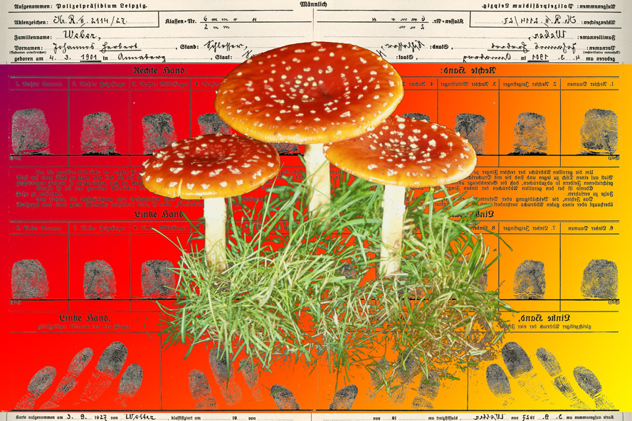 # ... hier wird die Zuordnung zu einem Triptychon schon etwas einfacher, wenn man so will. Mit den drei Fliegenpilzen ist die Anordnung: Mittelteil, linker Fluegel, rechter Fluegel, einem Altarbild entsprechend, getroffen. Der Hintergrund besteht aus einer gekonterten Karteikarte, weißt inhaltlich eher zynisch auf Koerpersymetrie hin. Das geht mit den, in Maerchen auftauchenden, giftigen Fliegenpilzen hand in hand. Soweit so gut.