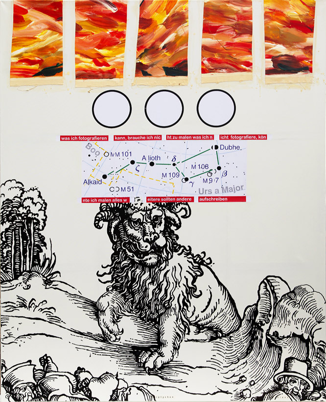 # ... Ich habe mich an Duerer gehalten, weil die damaligen kulturellen Verwerfungen auf sonderbare Weise denen der heutigen Zeit entsprechen (könnten). Ich möchte nicht ermahnen oder in Aufregung versetzen. Genaues Hinschauen ist eine Voraussetzung, wenn man den Vorgängen der Zeit annähernd nahe kommen will. Vielschichtigkeit, unterschiedliche Blickwinkel und Betrachtungsweisen, Transparenz (und Verdecken als Verwirrung) könnten Strategien der Nachsorge in der Zeit sein.