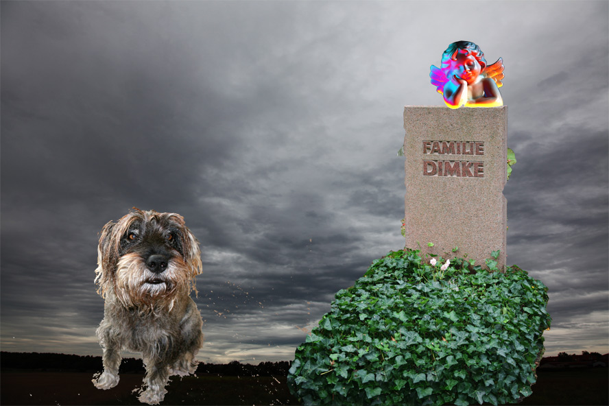 # ... es geht allerdings auch ironisch, wenn es vom Sterben oder vom Gestorbensein handelt - Reinhold, unser Mittelschnauzer ist leider schon begraben und liegt am Haus - im Gegensatz zu der Familie, die lebt und ist lebendig (ja, noch) ...